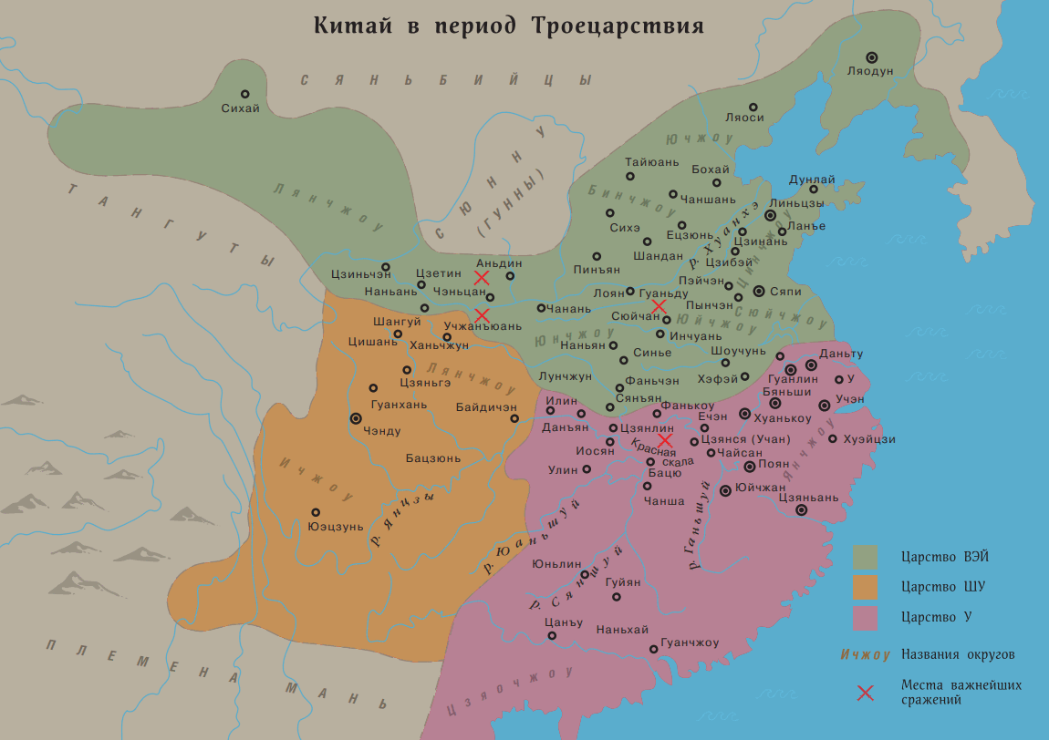 В течение десяти дней вся Поднебесная империя пришла в движение, большинство чиновников в провинциях, охваченных огнем восстания, бежало, двор был в панике. Но вскоре против повстанцев были брошены регулярные войска и вооруженные отряды крупных землевладельцев, через десять месяцев восставшие были разбиты наголову, хотя отдельные разрозненные отряды в разных местах страны продолжали действовать еще много лет. Разгром Желтых повязок связывают с именами военачальников: Юань Шао – выходца из знатного служилого рода, Цао Цао – первоначального сподвижника и друга Юань Шу, приемного сына влиятельного евнуха, Сунь Цзяня – правителя земель в среднем и нижнем течении реки Янцзы, которые именовались землями У или Дун У – Восточное У. Под началом Цао Цао первое время воевал и Лю Бэй – дальний потомок основателя династии Восточная Хань, который тоже участвовал в подавлении восстания Желтых повязок. Но когда восстание было в основном подавлено, то есть общая цель достигнута, военачальники стали бороться друг с другом за власть в Поднебесной. Император, по сути дела, превратился в игрушку в руках соперничающих клик. После смерти государя Лин-ди, в 189 году, на престоле воцаряется его сын Шаоди, но через несколько месяцев его свергает могущественный царедворец, полководец Дун Чжо, и сажает на престол другого сына покойного государя, рожденного от наложницы. Проходит семь лет, и безвольный император Сянь-ди попадает в руки Цао Цао – человека решительного, который не разбирался в средствах для достижения цели и благодаря этому добился высшего положения. Он привлек на свою сторону многих талантливых людей, ибо ценил не происхождение или знание конфуцианского этикета и канонических книг, а умение управлять народом и командовать войсками. Это был типичный средневековый диктатор, захвативший власть, но формально правивший от имени номинального государя. Однако под властью Цао Цао находился не весь тогдашний Китай, а в основном центральная его часть. Земли по Янцзы прочно удерживали представители рода Сунь – сперва Сунь Цзянь, а потом его сын Сунь Цюань, который основал царство У, в 221 году принял титул вана – высший княжеский титул, а через восемь лет провозгласил себя императором. Юго-западные земли Китая оказались во власти Лю Бэя, основавшего на них царство Шу и принявшего в 221 году титул императора. Сам Цао Цао еще раньше, в 216 году, объявил себя ваном (до этого он был первым министром), а когда он в 220 году умер, его сын Цао Пэй низложил ханьского императора Сянь-ди и объявил себя первым императором новой династии Вэй. Борьба за власть шла между тремя царствами ровно шестьдесят лет, пока страна не была объединена вновь в 280 году под эгидой новой династии Цзинь. Бурное время с начала восстания Желтых повязок и до нового объединения страны и есть те семьдесят шесть лет, в которые происходят все описываемые Ло Гуаньчжуном события.
