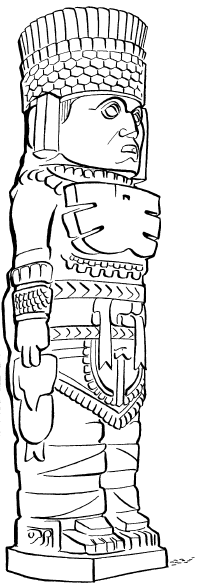 И тем не менее описание этого города не столь сказочно, как кажется на первый взгляд. Археологи обнаружили стены, покрытые замысловатой резьбой и росписью, ступенчатую пирамиду с остатками храма на вершине и символом Кецалькоатля – двумя каменными раскрашенными змеями высотой пятнадцать метров, которые служили «кариатидами» для изящных храмовых фасадов. Там были найдены скульптурные колонны для храма воинов; исполинские вырезанные из камня фигуры и этот скульптурный образ, который распространился дальше всего остального – полулежащая фигура Чак-Моола, безучастно глядящая в пространство и держащая каменный поднос, на который клали как пищу для богов трепещущие человеческие сердца. Точно такая же устрашающая фигура без каких-либо изменений будет вырезана и установлена в столице ацтеков, а другая окажется в тысяче километров восточнее, на Юкатане.