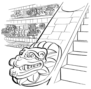 Рис. 10. Тольтек-Теотиуакан был классической культурой долины Мехико. Он просуществовал приблизительно с 300 года до н. э. до приблизительно 700 года н. э. Символ Кецалькоатля – змеиная голова в гирлянде из перьев кетцаля (квезала) – принадлежит тольтекам