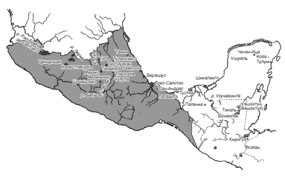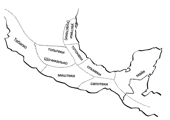 Рис. 1. Распределение доацтекских племен и культур по территории Центральной Мексики и Гватемалы-Юкатана. Ацтеки появились в виде самостоятельной культуры на территории, занятой тольтеками