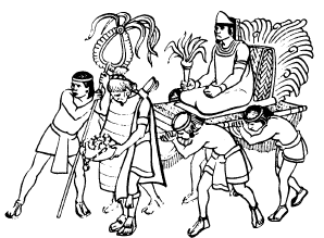 Сразу у входа в город они были встречены «царской» свитой: великий Монтесума сошел со своего паланкина и, поддерживаемый другими, последовал дальше «под великолепным балдахином из зеленых перьев, богато украшенным золотой и серебряной вышивкой, со свисающей каймой из жемчуга и [нефрита], и это было поразительное зрелище. Великий Монтесума был облачен в богатые одежды… множество других владык… шли впереди него, подметая землю, по которой он должен был ступать, и расстилали поверх нее ткани…»