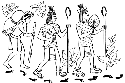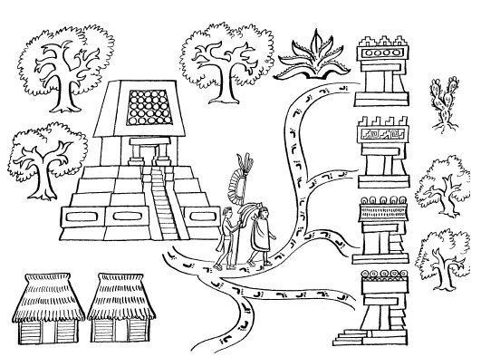 Рис. 12. Ацтекские храмы и дома; ацтекский правитель на пути к ним. Следы ног говорят о движении. Из ацтекского кодекса
