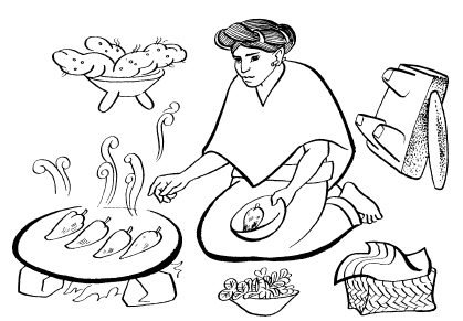 Рис. 14. Кулинария ацтеков. Вверху слева камоти (сладкий картофель); справа находится каменный метатль, на котором размалывают зерно. Женщина готовит красный перец на жаровне кумаль, а в нижнем правом углу лежат только что испеченные кукурузные лепешки; они накрыты, чтобы сохранить их свежесть