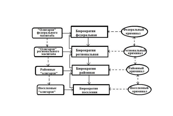 Обязательным элементом любой федерации является наличие криминала. В различных источниках по-разному описывают его структуру и подчинённость. Можно утверждать одно, что он тоже имеет интегрированную структуру, а вот связи между уровнями и властью самые различные. Поэтому все связи показаны пунктирными стрелками. Как влияет криминал на власть — сказать трудно. То, что — это взаимное влияние, примеров предостаточно.