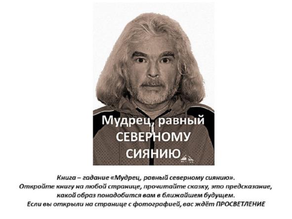 В России к гадалке не ходи — и так понятно, скучно не будет. Важно узнать, чего не хватает в образном восприятии мира, чтобы преодолеть следующую проблему. Бумажную книгу «Мудрец, равный северному сиянию» надо раскрыть на случайной странице, прочитать сказку о северосиятельном методе образного восприятия мира. Электронный вариант не дает такой возможности, потому что электронные тексты быстро меняются.
