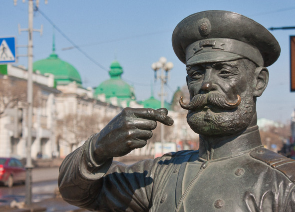 В начале 20 века о какой-то криминальной обстановке в Омске можно было говорить с большой натяжкой, потому автор скульптуры — Сергей Норышев — придал образу служивого романтическое настроение. Городовой щёгольски покручивает ус — скорее всего, мимо прошла дама. Говорят, если потереть ему рукоятку сабли — будешь под его защитой целый год, а в делах будет порядок.