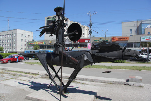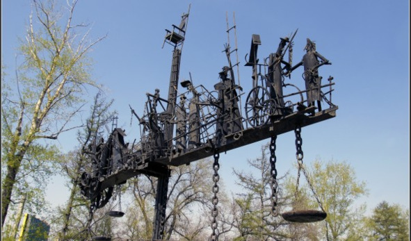 Омский скульптор Капралов изобразил здесь динамическое равновесие. Скульптура сама выполнена в виде гигантских весов, за плечи которых подвешены клетки. Клетки раскачиваются во время ветра. Сверху — стул, балансирующий на одной ножке. У этой работы много мелких деталей, которые и сами-то можно считать отдельными интересными скульптурами.