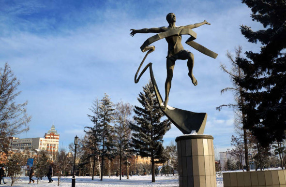 Скульптура установлена в месте начала и финиша ежегодного Омского марафона (SIM). Марафонец, разрывающий финишную ленточку. На монументе обозначены все победители марафона, каждый год добавляются новые.