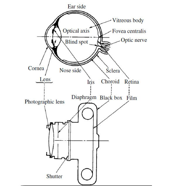 Прежде чем сравнивать различные источники света, рассмотрим механизм детектирования и обработки светового сигнала самым важным для нас оптическим прибором — человеческим глазом. Свет, падающий в глаз, вызывает фотохимические реакции в сетчатке, которая соответствует фотопленке. Нервный импульс, генерируемый в результате этой реакции, передается в мозг, генерируя зрительный сигнал. Сетчатка охватывает около двух третей внутреннего поверхность глазного яблока и представляет собой прозрачную пленку толщиной около 0,3 мм, со сложной структурой, включающей несколько типов клеток. Падающий свет попадает на сетчатку, как указано на рисунке, и достигает светочувствительного нейроэпителиального слоя. Оптический нерв, который расположен в передней части нейроэпителиального слоя, выполняет обработку сигнала.