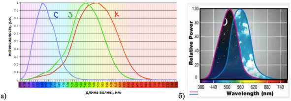 Рис. 1 а) Спектры чувствительности колбочек (С — синий, З — зеленый, К — красный) и б) кривая чувствительности палочек (фиолетовая кривая) и кривая суммарной чувствительности колбочек (синяя кривая)