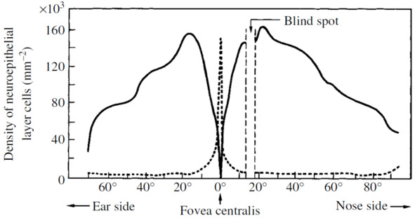 Осталось отметить, что распределение нейроэпителиальных клеток в сетчатке неравномерно. Колбочки сосредоточены в окрестности оптической оси в центральной ямке. Центральная ямка — это узкая область сетчатки, около 1,5 мм в диаметре, в которой расположено примерно 100000—150000 колбочек, поэтому максимальное разрешение достигается именно в этой узкой области. В отличие в колбочек, палочки практически отсутствуют в непосредственной близости от центральной ямки и распределены в широкой области сетчатки. Поскольку в темноте за зрение отвечают палочки, а не колбочки, звезды ночью более четко видны, если слегка сощурить глаза. Кроме того, поскольку в той части сетчатки, где проходит зрительный нерв, светочувствительные клетки отсутствуют, эта часть не может воспринимать свет и называется слепым пятном. Слепое пятно находится под углом 15º от оптической оси и составляет около 5º в ширину.