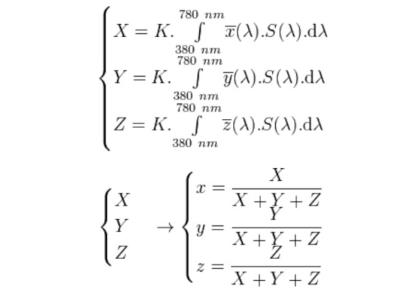 Чтобы определить компоненты вектора детектируемого света, спектр источника (S (λ)) следует по очереди умножить на каждую из функций цветового соответствия ((λ), ȳ (λ) и (λ)) с последующей нормировкой: