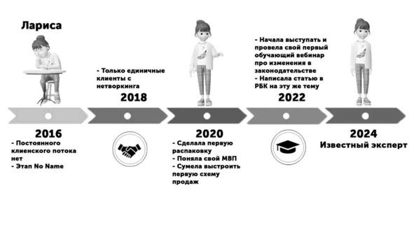 Например, жила-была юрист Лариса. В точке А у нее отсутствие постоянного потока клиентов и, как следствие, денег на развитие бизнеса. В результате проработок личного бренда Лариса теперь — известный юрист, и это дало ей возможность работать по новому чеку.
