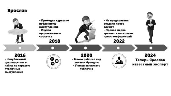 Жил-был Ярослав. И в начальной точке для него были неприемлемы выступления из-за сложностей с русским языком, страха публичности. После проведения медиатренинга и работы над публичным выступлением страх сцены ушел, а в компании было принято решение, что Ярослав, наемный топ-менеджер, вместе с собственником компании будет выступать на крупных федеральных и международных отраслевых конференциях. Таким образом, усиление личного бренда добавило компании упоминаемости в прессе и, конечно, известности бренду компании.
