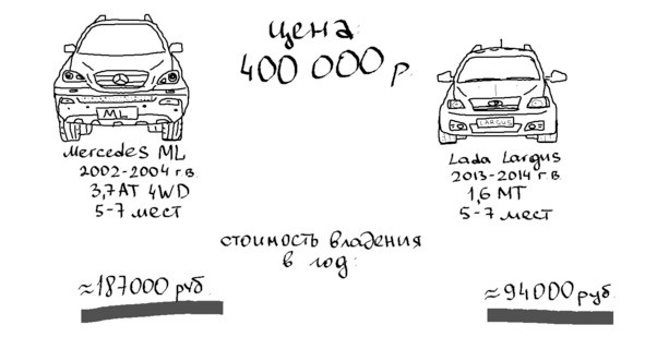Вот вам более наглядный пример. За 400 000 рублей сегодня на рынке можно купить Lada Largus 2013—2014 года выпуска и Mercedes-Benz ML примерно 2003 года выпуска. У Мерседеса есть климат-контроль, полный привод, ксеноновые фары, кожаный салон, машина сама по себе больше, к тому же шильдик заставляет соседей завидовать и прочее, и прочее — одни плюсы на первый взгляд. Однако обратимся к цифрам. Транспортный налог на Ларгус обойдется в год от 1044 до 3150 рублей в зависимости от двигателя, а за Мерседес ежегодно придется платить от 7335 до 45080 рублей. Расходы на бензин при прочих равных: 56000 рублей в год у Ларгуса против 86000 у МL.