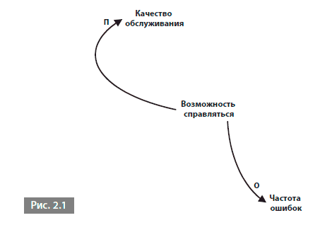 А что произойдет, если наша возможность справляться начнет снижаться? Давайте сначала посмотрим на диаграмму, а затем дадим ответ, руководствуясь здравым смыслом. Стрелка с буквой П означает, что возможность справляться и качество обслуживания движутся в одном направлении. Следовательно, если возможность справляться идет на спад, как показывает диаграмма, качество обслуживания также понижается. Все логично. А если возможность справляться растет, то, как указывает буква О, переменная частоты ошибок движется в противоположном направлении. Это тоже вполне логично: когда наша возможность справляться понижается, мы оказывается в ситуации стресса и совершаем больше ошибок. Иначе говоря, диаграмма работает в обоих направлениях.