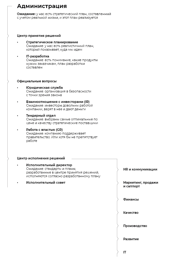 Оргструктура постоянно подвергается анализу. Если выявили роль, которая не прописана в оргструктуре, но важна для компании, — ее нужно вписать в оргструктуру и назначить ответственного за исполнение этой роли. Совсем не обязательно, чтобы все люди были в штате, но если функция есть, то должна выполняться и под нее должны быть выведены ресурсы. Это либо HR-ресурсы, либо бюджет на подрядчика.