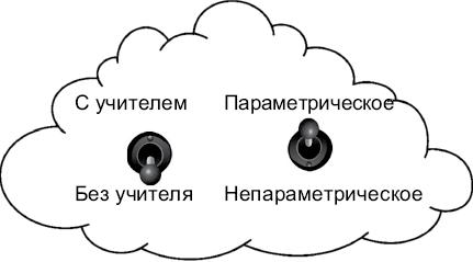 На предыдущих двух страницах мы выяснили, что все алгоритмы машинного обучения делятся на две группы: с учителем и без учителя. Теперь обсудим деление на две группы по другим признакам: параметрические и непараметрические. Можно представить, что облако алгоритмов машинного обучения имеет два переключателя: