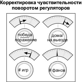 На этом этапе модель поворачивает регуляторы, учитывая величину ошибки (98 %) и исходные данные на момент прогноза (статистика состязаний), чтобы уточнить прогноз по заданным исходным данным.