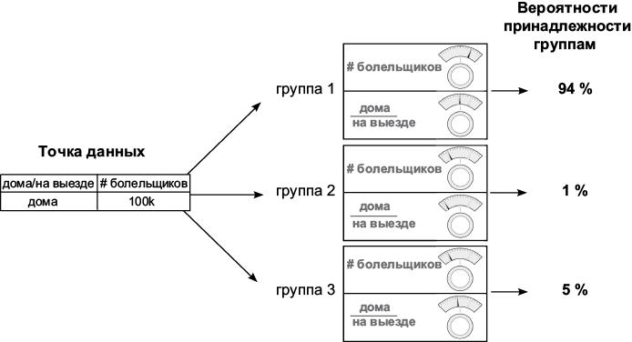 В параметрическом обучении без учителя используется схожий подход. Давайте рассмотрим в общих чертах этапы такого обучения. Не забывайте, что, по сути, обучение без учителя осуществляет группировку данных. В параметрическом обучении без учителя регуляторы используются для группировки данных. В этом случае обычно имеется несколько регуляторов по числу групп, каждый из которых отражает близость входных данных к конкретной группе (с некоторыми исключениями и нюансами не забывайте, что это всего лишь обобщенное описание). Рассмотрим пример, предполагающий деление данных на три группы.