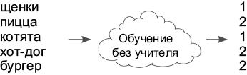Взгляните на этот пример. Сможете ли вы понять, по какому принципу алгоритм объединил слова, несмотря на то что он ничего не сообщает о природе кластеров? (Ответ: 1 == няшки и 2 == вкусняшки.) Позже мы выясним, что другие формы обучения без учителя тоже являются лишь разновидностями кластеризации, и узнаем, как эти кластеры могут пригодиться в обучении с учителем.