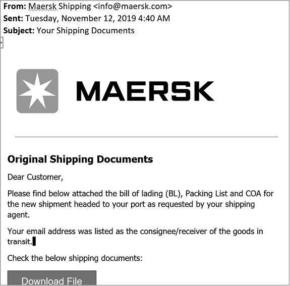 Ниже приведен пример спамерского письма с предложением загрузить якобы накладную на товар (файл с вирусом). Спамер маскируется под известный бренд компании-экспедитора. Расчёт на то, что адресат или его фирма работает с этой компанией. Обратный адрес, конечно, подставной.