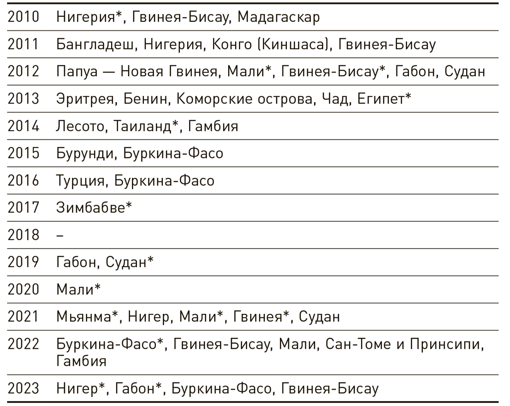 Таблица 1. Успешные перевороты (*) и попытки переворотов в странах мира (2010–2023)