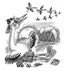 Вдруг в небе показалась пара белых лебедей. Они догоняли свою стаю, чтобы вместе с ней улететь на зимовку в жаркие края. Заметив, Аиста, толкающего арбуз, они закричали: