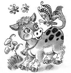 На лугу, где паслись коровы, маленький Бычок медленно щипал траву. Так делали все в их стаде. Вдруг ему стало скучно. Он приподнял голову и увидел, что рядом с ним порхают бабочки, которые совсем не обращают на него внимания. От цветочного запаха в носу у него защекотало, и он чихнул. Бабочки разлетелись в разные стороны и только одна, самая любопытная, осталась. Смешной Бычок ей понравился, и она села ему на спину.