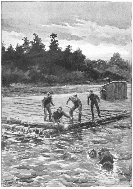 “Slowly battling with the waves, Jake and his precious burden drew near the raft. Already Ben Smithers was reaching out his pike-pole. Suddenly there was a crash, and the raft stopped short, quivering, while the waves poured over its upper edge. The timbers of the farther inshore corner had run aground and wedged fast.