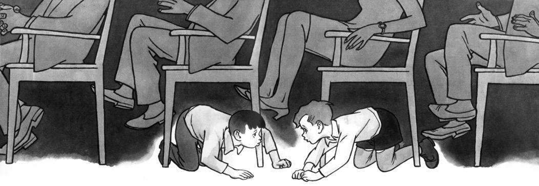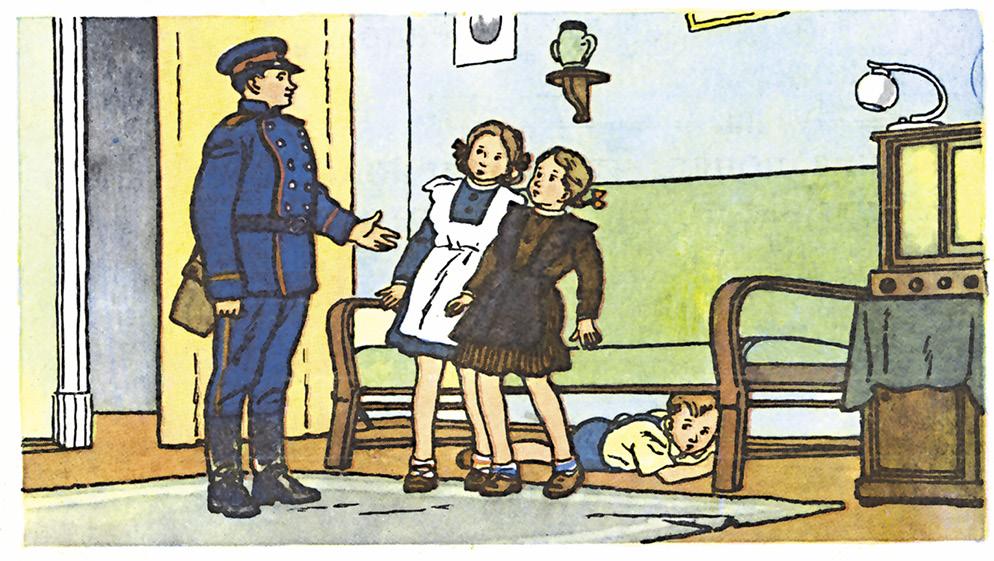 Марина и Ира вошли вместе с милиционером в комнату и увидели, что Сашка куда-то исчез. Марина даже заглянула под диван. Сашка увидел её и молча погрозил ей из-под дивана кулаком, чтобы она не выдавала его.