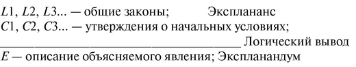 Легко заметить, что представленная структура объяснения выражает логический вывод modus ponens, посылки которого называются экспланансом (объясняющее), а следствие — экспланандумом (объясняемое). Эксплананс должен включать в себя по крайней мере одно общее утверждение, и экспланандум должен логически следовать из эксплананса. Мы привели простейший вариант дедуктивно-номологического объяснения. Он допускает разнообразные модификации и обобщения. В общем случае в эксплананс может входить несколько общих и единичных утверждений, а вывод — представлять собой цепочку логических умозаключений. На месте экспланандума может находиться как описание отдельного события, так и общее утверждение (закон), и даже теория. К. Гемпель разработал вариант индуктивно-вероятностного объяснения, в котором используемое для объяснения общее положение носит вероятностно-статистический характер. Если ограничиться дедуктивно-номологическим объяснением, то его общую схему можно представить следующим образом: