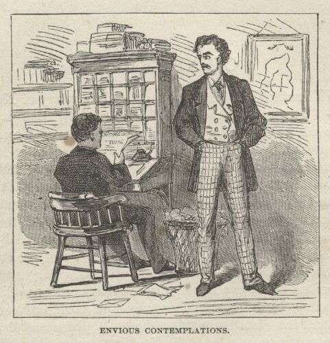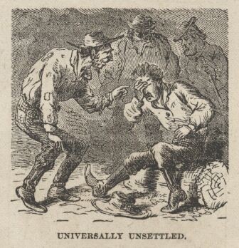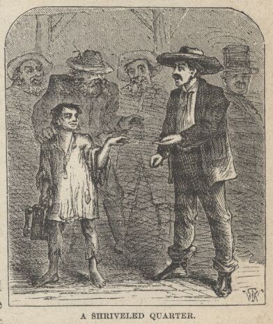 I met men at every turn who owned from one thousand to thirty thousand "feet" in undeveloped silver mines, every single foot of which they believed would shortly be worth from fifty to a thousand dollars—and as often as any other way they were men who had not twenty-five dollars in the world. Every man you met had his new mine to boast of, and his "specimens" ready; and if the opportunity offered, he would infallibly back you into a corner and offer as a favor to you, not to him, to part with just a few feet in the "Golden Age," or the "Sarah Jane," or some other unknown stack of croppings, for money enough to get a "square meal" with, as the phrase went. And you were never to reveal that he had made you the offer at such a ruinous price, for it was only out of friendship for you that he was willing to make the sacrifice. Then he would fish a piece of rock out of his pocket, and after looking mysteriously around as if he feared he might be waylaid and robbed if caught with such wealth in his possession, he would dab the rock against his tongue, clap an eyeglass to it, and exclaim: