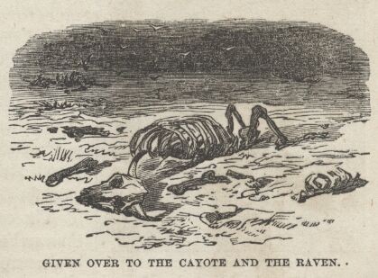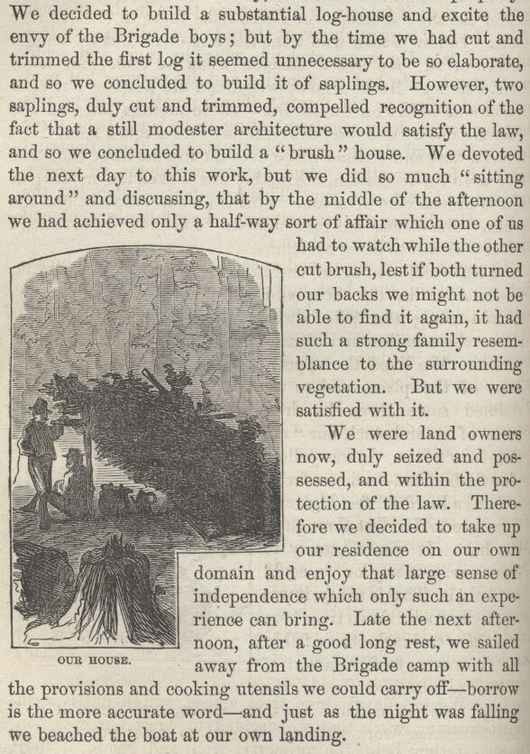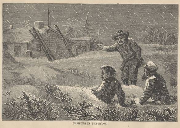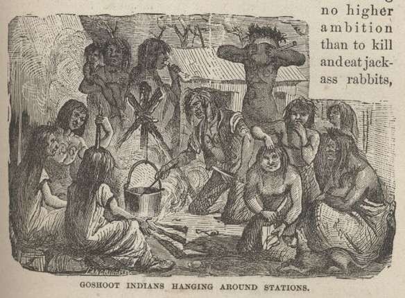We built a small, rude cabin in the side of the crevice and roofed it with canvas, leaving a corner open to serve as a chimney, through which the cattle used to tumble occasionally, at night, and mash our furniture and interrupt our sleep. It was very cold weather and fuel was scarce. Indians brought brush and bushes several miles on their backs; and when we could catch a laden Indian it was well—and when we could not (which was the rule, not the exception), we shivered and bore it.