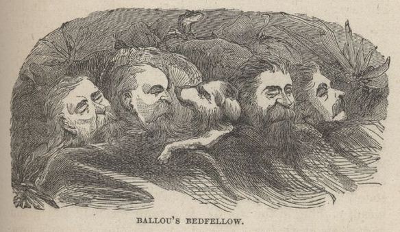 We four always spread our common stock of blankets together on the frozen ground, and slept side by side; and finding that our foolish, long-legged hound pup had a deal of animal heat in him, Oliphant got to admitting him to the bed, between himself and Mr. Ballou, hugging the dog's warm back to his breast and finding great comfort in it. But in the night the pup would get stretchy and brace his feet against the old man's back and shove, grunting complacently the while; and now and then, being warm and snug, grateful and happy, he would paw the old man's back simply in excess of comfort; and at yet other times he would dream of the chase and in his sleep tug at the old man's back hair and bark in his ear. The old gentleman complained mildly about these familiarities, at last, and when he got through with his statement he said that such a dog as that was not a proper animal to admit to bed with tired men, because he was "so meretricious in his movements and so organic in his emotions." We turned the dog out.
