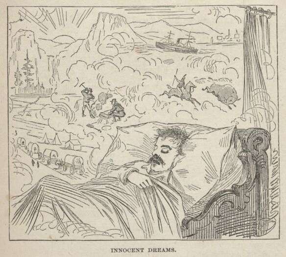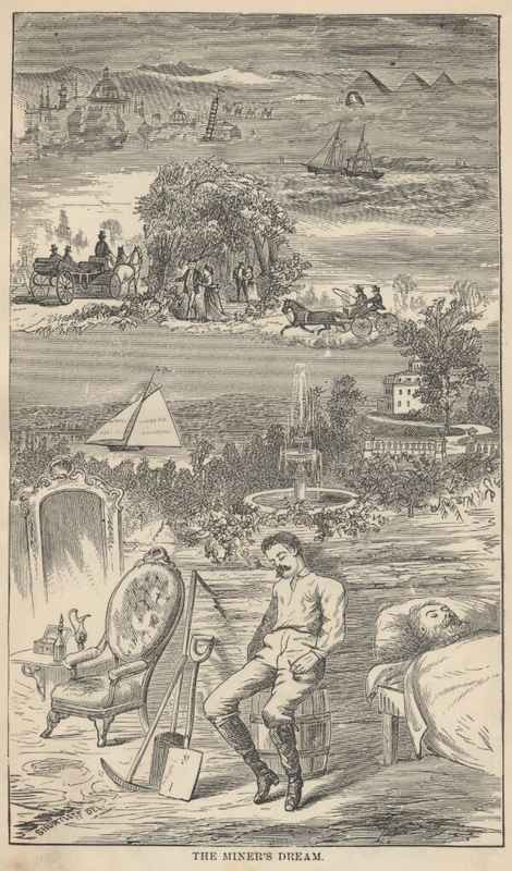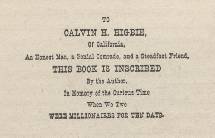 By and by I was smitten with the silver fever. "Prospecting parties" were leaving for the mountains every day, and discovering and taking possession of rich silver-bearing lodes and ledges of quartz. Plainly this was the road to fortune. The great "Gould and Curry" mine was held at three or four hundred dollars a foot when we arrived; but in two months it had sprung up to eight hundred. The "Ophir" had been worth only a mere trifle, a year gone by, and now it was selling at nearly four thousand dollars a foot! Not a mine could be named that had not experienced an astonishing advance in value within a short time. Everybody was talking about these marvels. Go where you would, you heard nothing else, from morning till far into the night. Tom So-and-So had sold out of the "Amanda Smith" for $40,000—hadn't a cent when he "took up" the ledge six months ago. John Jones had sold half his interest in the "Bald Eagle and Mary Ann" for $65,000, gold coin, and gone to the States for his family. The widow Brewster had "struck it rich" in the "Golden Fleece" and sold ten feet for $18,000—hadn't money enough to buy a crape bonnet when Sing-Sing Tommy killed her husband at Baldy Johnson's wake last spring. The "Last Chance" had found a "clay casing" and knew they were "right on the ledge"—consequence, "feet" that went begging yesterday were worth a brick house apiece to-day, and seedy owners who could not get trusted for a drink at any bar in the country yesterday were roaring drunk on champagne to-day and had hosts of warm personal friends in a town where they had forgotten how to bow or shake hands from long-continued want of practice. Johnny Morgan, a common loafer, had gone to sleep in the gutter and waked up worth a hundred thousand dollars, in consequence of the decision in the "Lady Franklin and Rough and Ready" lawsuit. And so on—day in and day out the talk pelted our ears and the excitement waxed hotter and hotter around us.
