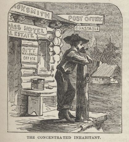 It was the strangest phase of life one can imagine. It was a beggars' revel. There was nothing doing in the district—no mining—no milling—no productive effort—no income—and not enough money in the entire camp to buy a corner lot in an eastern village, hardly; and yet a stranger would have supposed he was walking among bloated millionaires. Prospecting parties swarmed out of town with the first flush of dawn, and swarmed in again at nightfall laden with spoil—rocks. Nothing but rocks. Every man's pockets were full of them; the floor of his cabin was littered with them; they were disposed in labeled rows on his shelves.