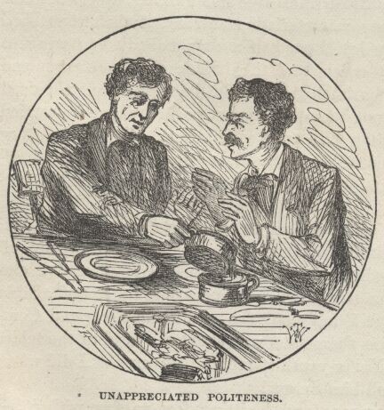 The coffee we made of this water was the meanest compound man has yet invented. It was really viler to the taste than the unameliorated water itself. Mr. Ballou, being the architect and builder of the beverage felt constrained to endorse and uphold it, and so drank half a cup, by little sips, making shift to praise it faintly the while, but finally threw out the remainder, and said frankly it was "too technical for him."