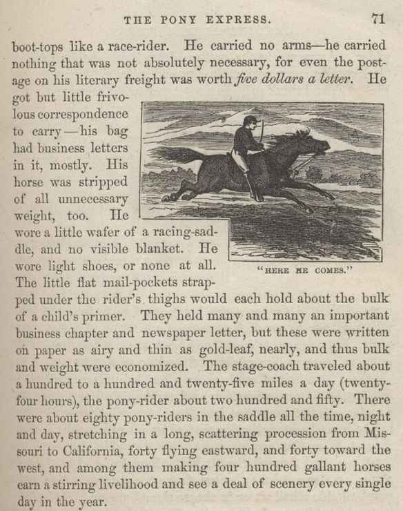 CHAPTER VIII. The Pony Express—Fifty Miles Without Stopping—"Here he Comes"—Alkali Water—Riding an Avalanche—Indian Massacre
