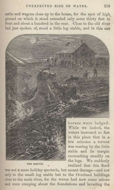 At seven in the evening we went to bed in the second story—with our clothes on, as usual, and all three in the same bed, for every available space on the floors, chairs, etc., was in request, and even then there was barely room for the housing of the inn's guests. An hour later we were awakened by a great turmoil, and springing out of bed we picked our way nimbly among the ranks of snoring teamsters on the floor and got to the front windows of the long room. A glance revealed a strange spectacle, under the moonlight. The crooked Carson was full to the brim, and its waters were raging and foaming in the wildest way—sweeping around the sharp bends at a furious speed, and bearing on their surface a chaos of logs, brush and all sorts of rubbish. A depression, where its bed had once been, in other times, was already filling, and in one or two places the water was beginning to wash over the main bank. Men were flying hither and thither, bringing cattle and wagons close up to the house, for the spot of high ground on which it stood extended only some thirty feet in front and about a hundred in the rear. Close to the old river bed just spoken of, stood a little log stable, and in this our horses were lodged.