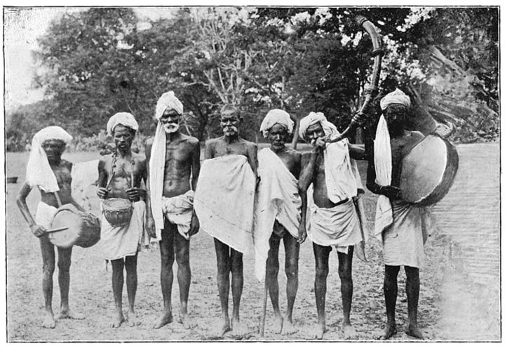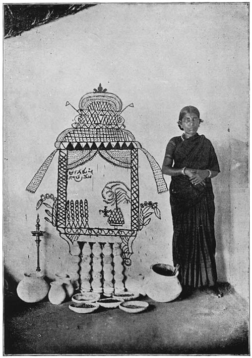 Concerning the caste-beggars of the Pallis, and their legendary history, I read the following account.25 “I came upon a noisy procession entering one of the main streets of a town not far from Madras. It was headed by spearmen, swordsmen, and banner-bearers, the last carrying huge flags (palempores) with representations of lions, tigers, monkeys, Brahmany kites, goblins and dwarfs. The centre of attraction consisted of some half dozen men and women in all the bravery of painted faces and gay clothing, and armed with swords, lances, and daggers. Tom-toms, trumpets, cymbals, and horns furnished the usual concomitant of ear-piercing music, while the painted men and women moved, in time with it, their hands and feet, which were encircled by rows of tiny bells. A motley following of the tag-rag and bob-tail of the population, which had been allured thither by the noise and clamour, brought up the rear of the procession, which stopped at each crossing. At each halt, the trumpeters blew a great and sonorous blast, while one of the central figures, with a conspicuous abdominal development, stepped forward, and, in a stentorian voice, proclaimed the brave deeds performed by them in the days gone by, and challenged all comers to try conclusions with them, or own themselves beaten. I was told that the chief personages in the show were Jātipillays (literally, children of the caste), who had arrived in the town in the course of their annual tour of the country, for collecting their perquisites from all members of the Palli or Padiāchi caste, and that this was how they announced their arrival. The perquisite levied is known as the talaikattu vari (poll-tax, or literally the turban tax), a significant expression when it is borne in mind that only the adult male members of the caste (those who are entitled to tie a cloth round their heads) are liable to pay it, and not the women and children. It amounts to but one anna per head, and is easily collected. The Jātipillays also claim occult powers, and undertake to exhibit their skill in magic by the exorcism of devils, witchcraft and sorcery, and the removal of spells, however potent. This operation is called modi edukkirathu, or the breaking of spells, and sometimes the challenge is taken up by a rival magician of a different caste. A wager is fixed, and won or lost according to the superior skill of the challenger or challenged. Entering into friendly chat with one of the leading members of the class, I gleaned the following legend of its origin, and of the homage accorded to it by the Pallis. In remote times, when Salivahana was king of the Chōla country, with its capital at Conjeeveram, all the principal castes of South India had their head-quarters at the seat of government, where each, after its own way, did homage to the triple deities of the place, namely, Kamakshi Amman, Ekambrasvarar, and Sri Varadarājaswāmi. Each caste got up an annual car festival to these deities. On one of these occasions, owing to a difference which had arisen between the Seniyans (weavers), who form a considerable portion of the population of Conjeeveram, on one side, and the Pallis or Vanniyans on the other, some members of the former caste, who were adepts in magic, through sheer malevolence worked spells upon the cars of the Pallis, whose progress through the streets first became slow and tedious, and was finally completely arrested, the whole lot of them having come to a stand-still, and remaining rooted on the spot in one of the much frequented thoroughfares of the city. The Pallis put on more men to draw the cars, and even employed elephants and horses to haul them, but all to no purpose. As if even this was not sufficient to satisfy their malignity, the unscrupulous Seniyars actually went to King Salivahana, and bitterly complained against the Pallis of having caused a public nuisance by leaving their cars in a common highway to the detriment of the public traffic. The king summoned the Pallis, and called them to account, but they pleaded that it was through no fault of theirs that the cars had stuck in a thoroughfare, that they had not been negligent, but had essayed all possible methods of hauling them to their destination by adding to the number of men employed in pulling them, and by having further tried to accelerate their progress with the aid of elephants, camels, and horses, but all in vain. They further declared their conviction that the Seniyars had played them an ill-turn, and placed the cars under a spell. King Salivahana, however, turned a deaf ear to these representations, and decreed that it was open to the Pallis to counteract the spells of their adversaries, and he prescribed a period within which this was to be effected. He also tacked on a threat that, in default of compliance with his mandate, the Pallis must leave his kingdom for good and ever. The Pallis sought refuge and protection of the goddess Kamakshi Amman, whose pity was touched by their sad plight, and who came to their aid. She appeared to one of the elders of the caste in a dream, and revealed to him that there was a staunch devotee of hers—a member of their caste—who alone could remove the spells wrought by the Seniyars, and that this man, Ramasawmy Naikan, was Prime Minister in the service of the Kodagu (Coorg) Rāja. The desperate plight they were in induced the Pallis to send a powerful deputation to the Rāja, and to beg of him to lend them the services of Ramasawmy Naik, in order to save them from the catastrophe which was imminent. The Rāja was kind enough to comply. The Naik arrived, and, by virtue of his clairvoyant powers, took in the situation at a glance. He found myriads of imps and uncanny beings around each of the car-wheels, who gripped them as by a vice, and pulled them back with their sinewy legs and hands every time an attempt was made to drag them forwards. Ramasawmy Naik by no means liked the look of things, for he found that he had all his work cut ou