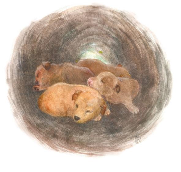 Где-то рядом раздалось кряхтение, переходящее в смешное первое рычание. Это резвились и боролись на траве старшие братики Сури. Один из щенков, тёмно-коричневый крупный бутуз, повалил своего брата спиной на траву и, стоя над ним, трепал его за ухо. Он делал очень сердитый и даже страшный вид, представляя себя очень большим взрослым псом, победившим соперника. Но на самом деле его зубки едва выросли и не могли никак прокусить ухо, а рычание было больше похоже на урчание в животе. Его брат лежал спиной на мягкой травке, радостно болтая в воздухе всеми четырьмя лапами. Он изо всех сил пытался оскалить зубы, как это делают взрослые, но всё равно было видно, что он улыбается, подставляя мордочку солнцу.
