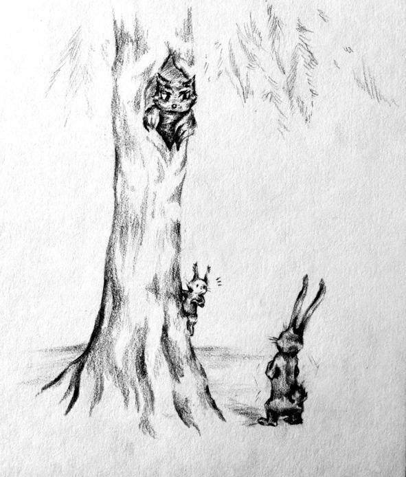 Бельчонок взобрался по сосне, в стволе которой находился дупло старого Филина, и начал барабанить лапками по стволу. Наконец, встрёпанная голова старика показалась в проеме дупла.