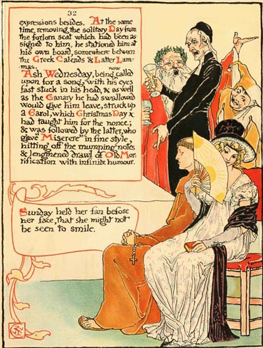 Ash Wednesday, being now called upon for a song, with his eyes fast stuck in his head, & as well as the Canary he had swallowed would give him leave, struck up a Carol, which Christmas Day had taught him for the nonce; & was followed by the latter, who gave “Miserere” in fine style, hitting off the mumping notes & lengthened drawl of Old Mortification with infinite humour.