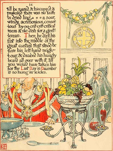 till he roared, & hiccupp’d, & protested there was no faith in dried ling, a sour, windy, acrimonious, censorious hy-po-crit-crit-critical mess & no dish for a gentleman. Then he dipt his fist into the middle of the great custard that stood before his left-hand neighbour, & daubed his hungry beard all over with it, till you would have taken him for the Last Day in December it so hung in icicles.