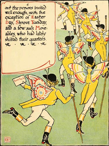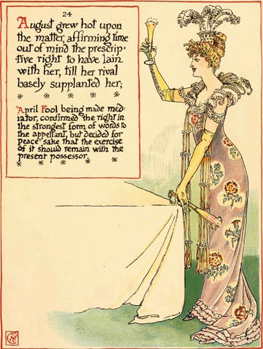 April Fool, who likes a bit of sport above measure, & had some pretensions to the lady besides as being but a cousin once removed,—clapped & halloo’d them on; and as fast as their indignation cooled those mad wag’s, the Ember Days, were at it with their bellows, to blow it into a flame; & all was in a ferment: till old Madame Septuagesima {who boasts herself the Mother of the Days} wisely diverted the conversation with a tedious