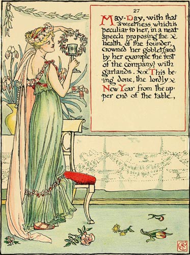 May-Day, with that sweetness which is peculiar to her, in a neat speech proposing the health of the founder, crowned her goblet, {and by her example the rest of the company} with garlands. This being done, the lordly New Year from the upper end of the table,