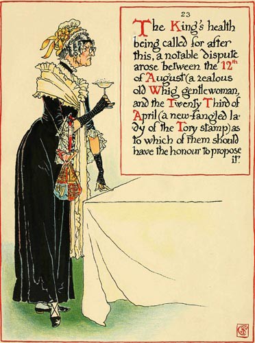 The King’s health being called for after this, a notable dispute arose between the 12th of August (a zealous old Whig gentlewoman), and the Twenty Third of April (a new-fangled lady of the Tory stamp) as to which of them should have the honour to propose it.