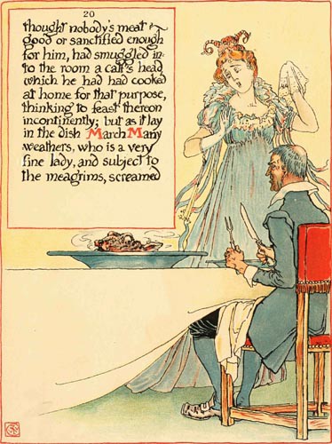 thought nobody’s meat good or sanctified enough for him, had smuggled into the room a calf’s head, which he had had cooked at home for that purpose, thinking to feast thereon incontinently; but as it lay in the dish March Many-weathers, who is a very fine lady, and subject to the meagrims, screamed