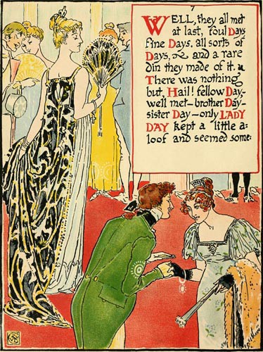 Well, they all met at last, foul Days, fine Days, all sorts of Days, and a rare din they made of it. There was nothing but, Hail! fellow Day,—well met—brother Day—sister Day—only LADY DAY kept a little aloof and seemed some